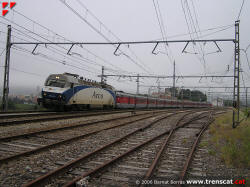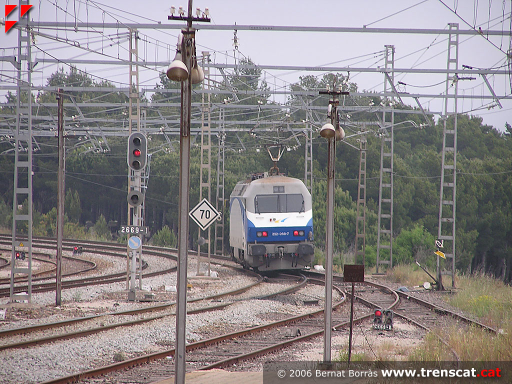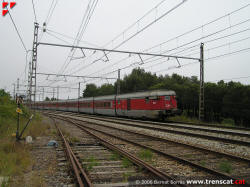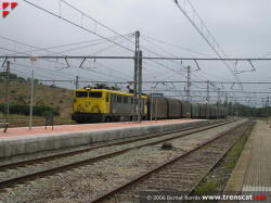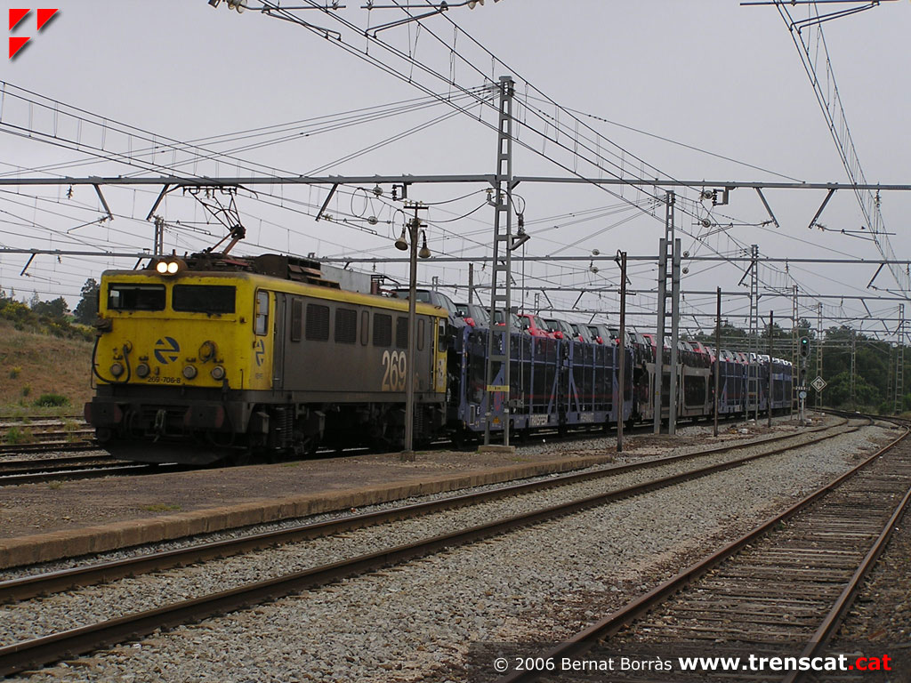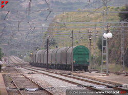 Una 269 remolcant una composició de vagons Shimms cap al sud (maig 2006) |