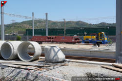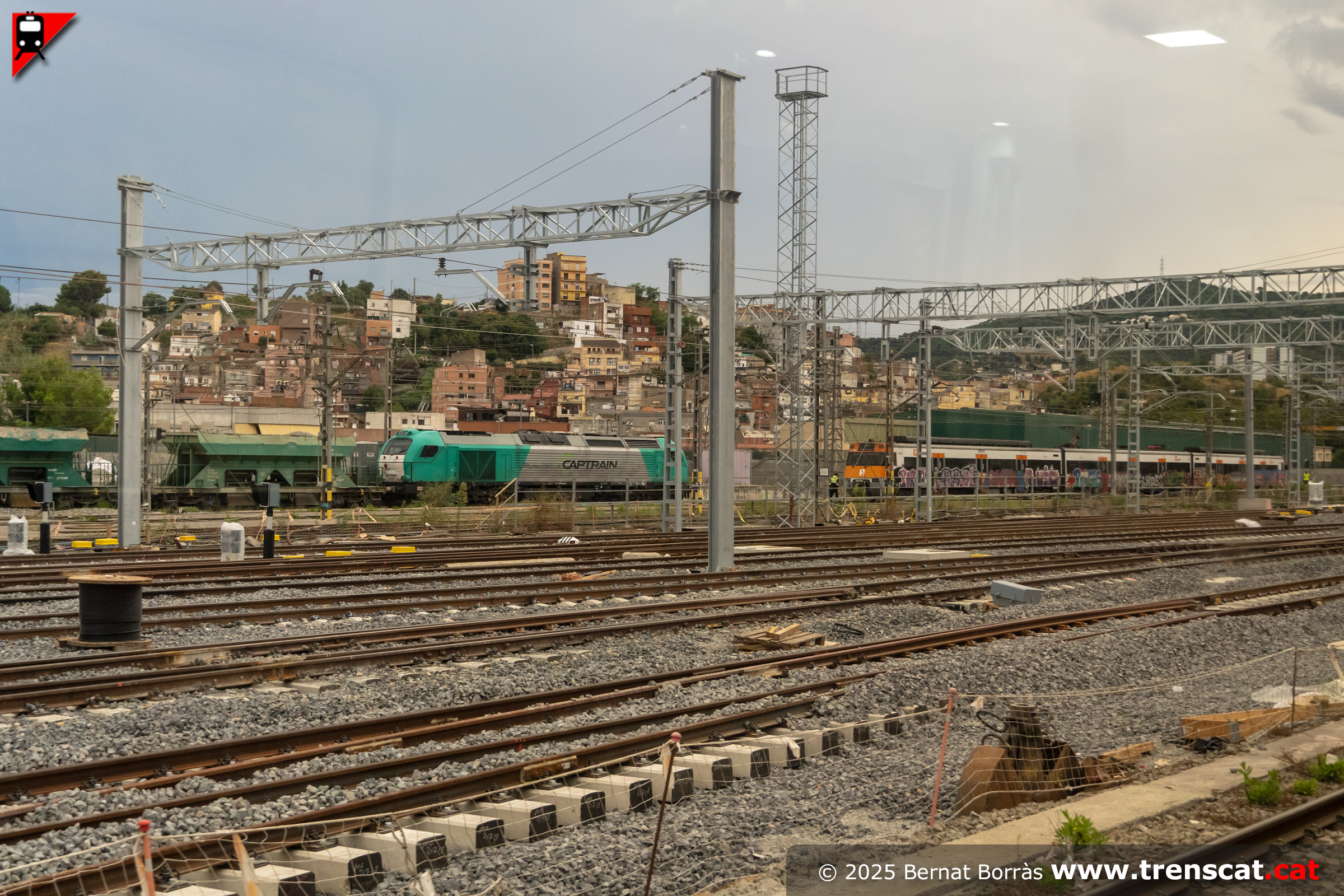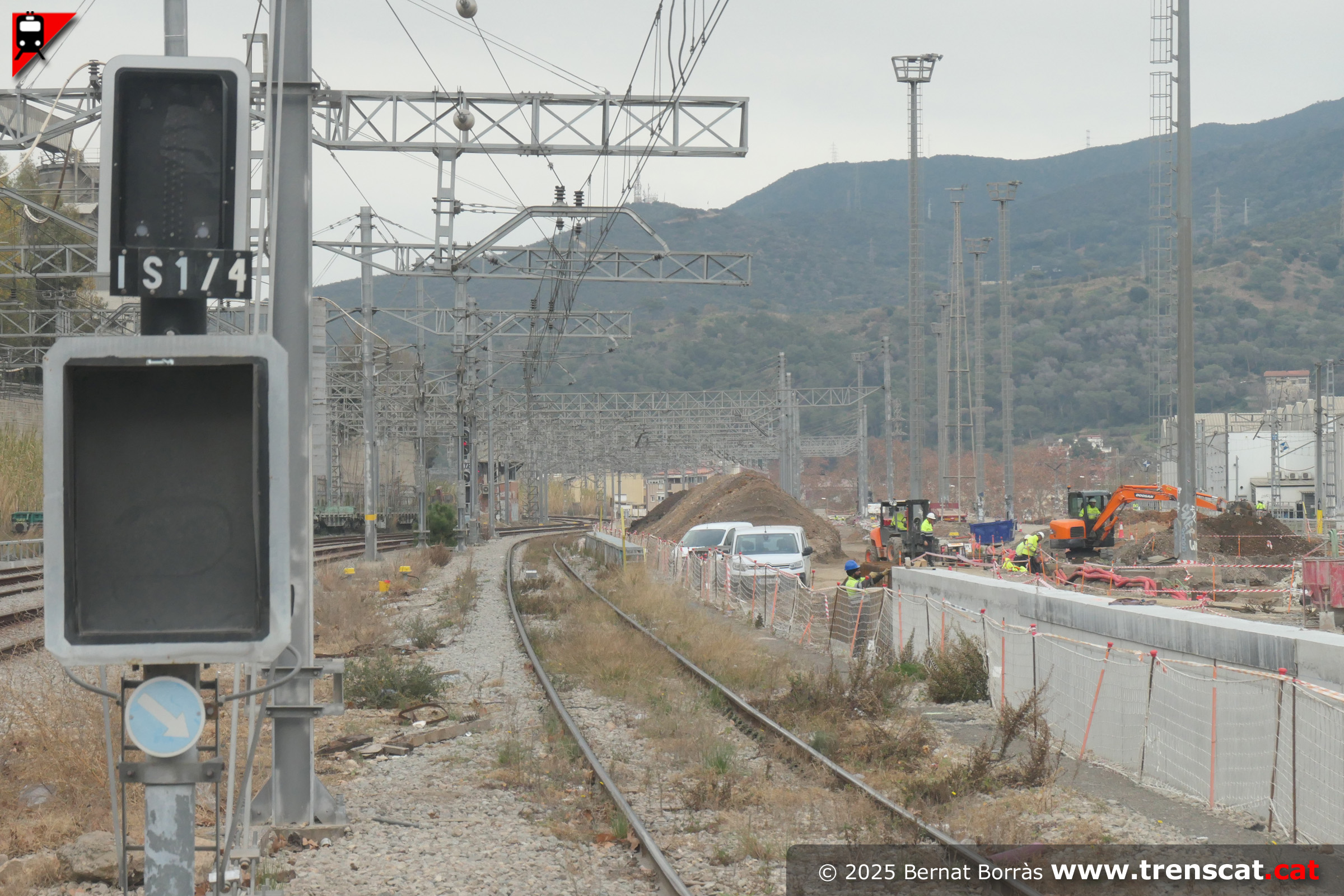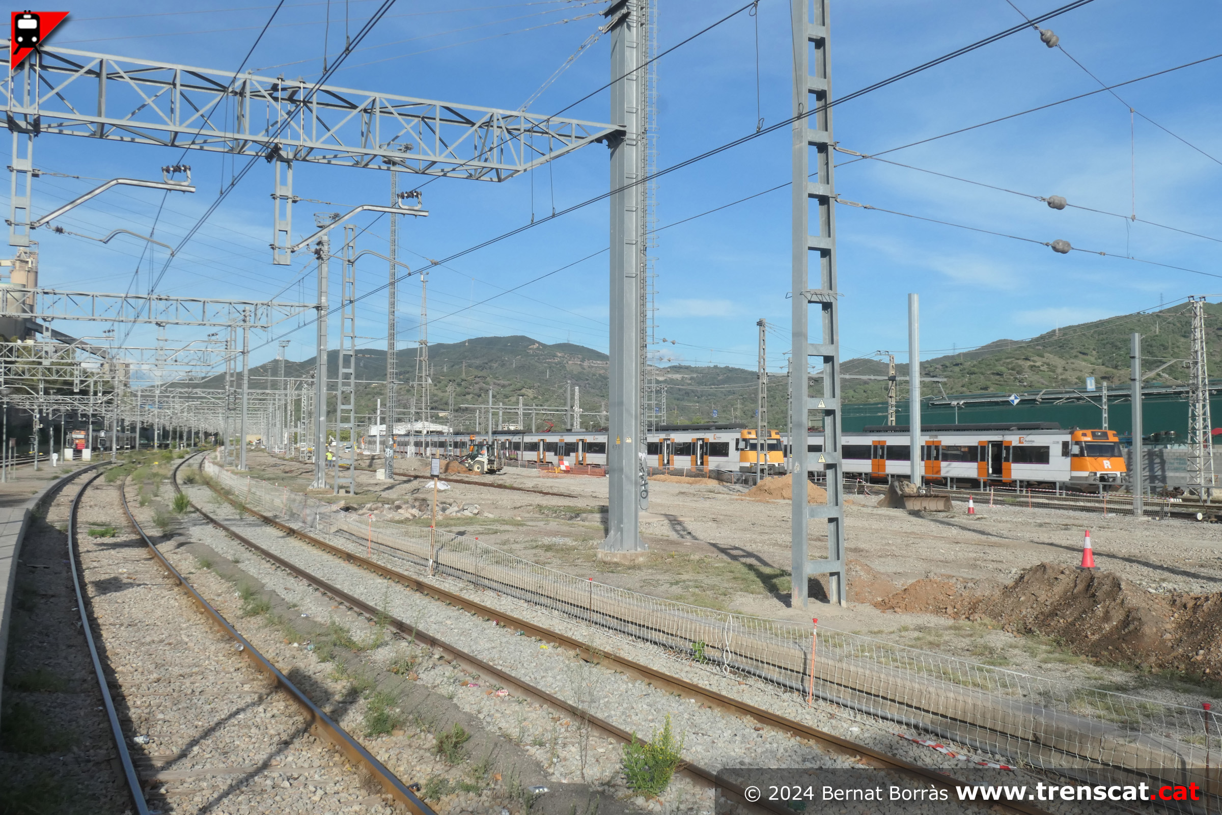 Vies al costat nord de la zona d'andanes de la nova Montcada Bifurcació. Al fons la 335-014 de Captrain amb vagons tremuja per a les obres (setembre 2025) |