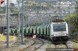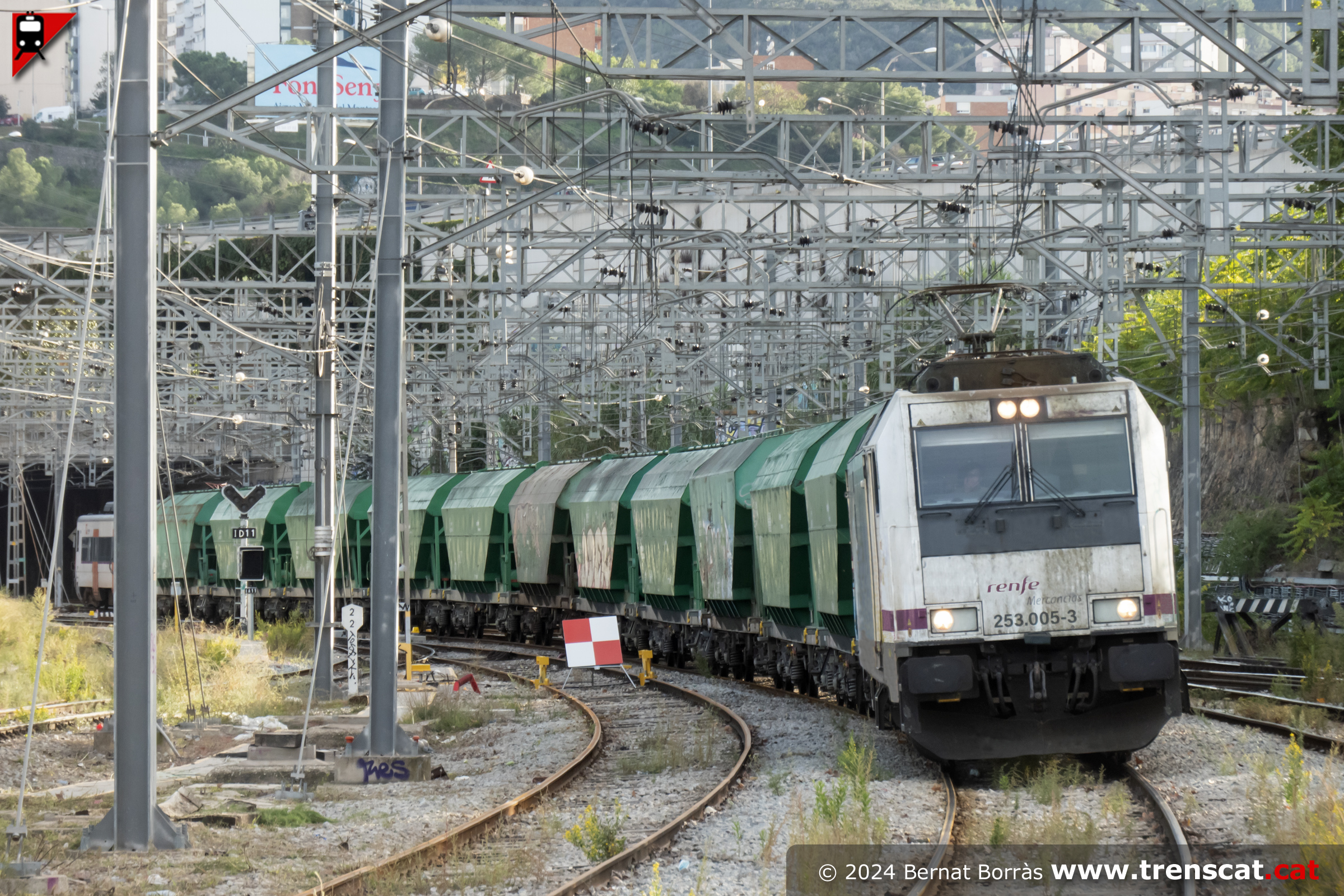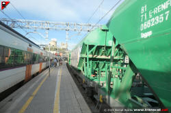 Mentre duren les obres a Montcada Bifurcació el tren de cereal de Vic al port de Tarragona ha d’invertir la marxa a Sant Andreu. Aquí el veiem de tornada de l’estació barcelonina al seu pas per la via 4 de Montcada Bifurcació per seguir cap a Cerdanyola del Vallès, Castellbisbal i Tarragona (octubre 2024) |