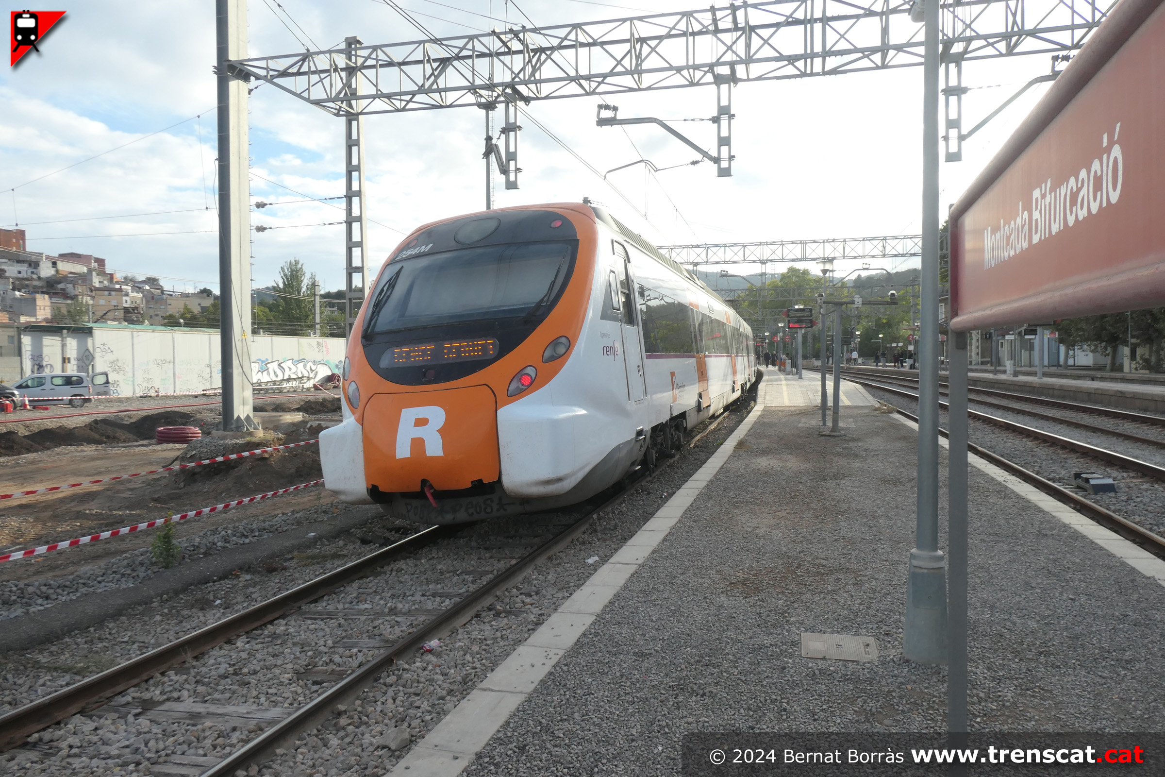 | Rètol de Montcada Bifurcació i unitats 447 per la via 2 (octubre 2024) |