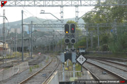 Llum groc al senyal de sortida de la via 4 pel costat Barcelona amb l'itinerari fet cap a la línia a Torre Baró (octubre 2024) |