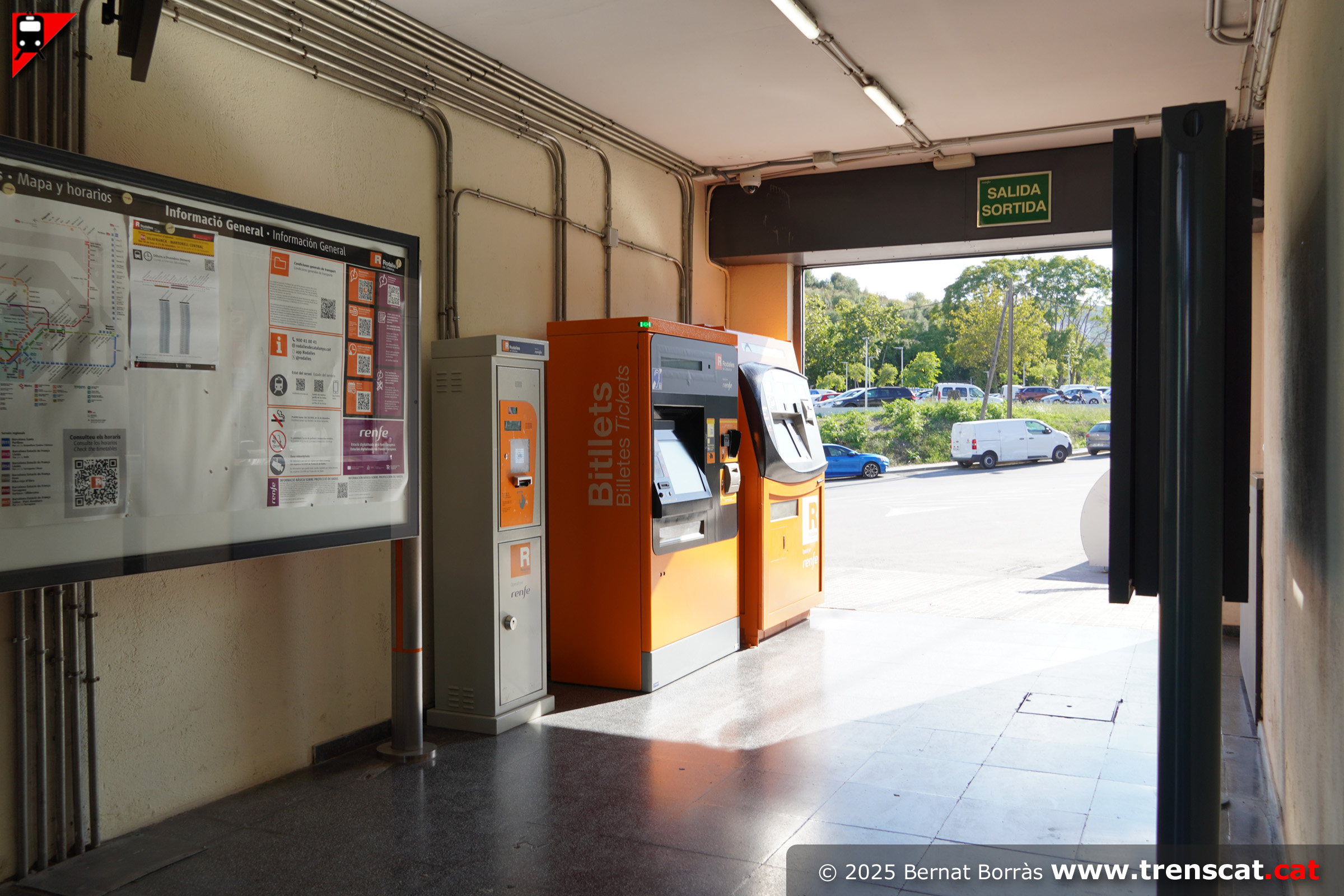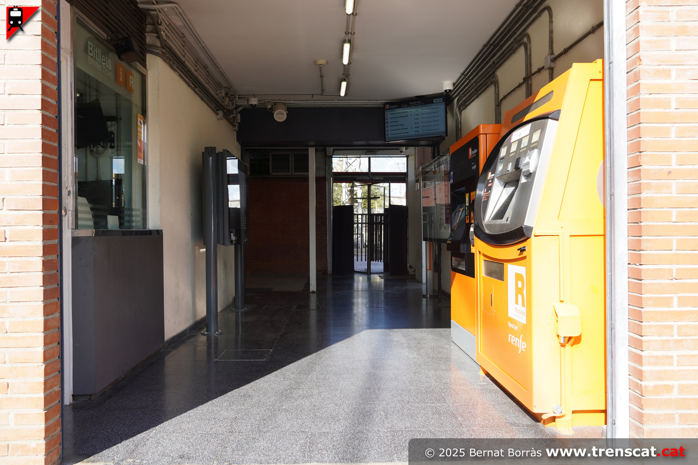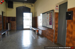 Petit vestíbul de l'estació, amb les màquines de venda de bitllets, la taquilla, una validadora i plafons d'informació (setembre 2025) |