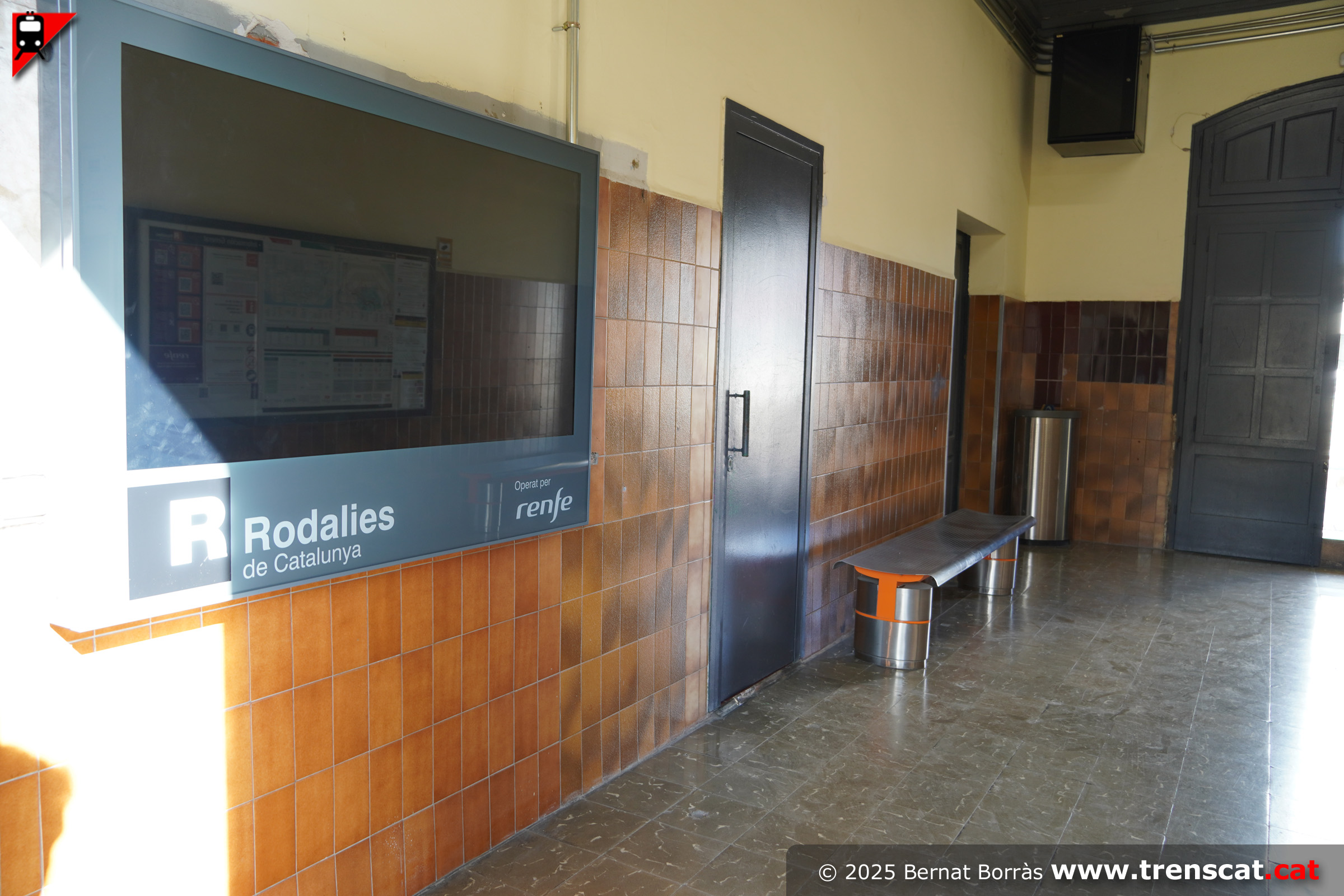 | Interior de l'edifici de viatgers històric de Montcada Bifurcació, que de fet té poca afluència en haver-hi pocs punt de generació de mobilitat a la banda oest de les vies de l'estació (setembre 2025) |