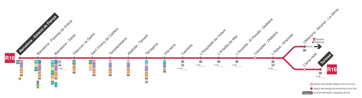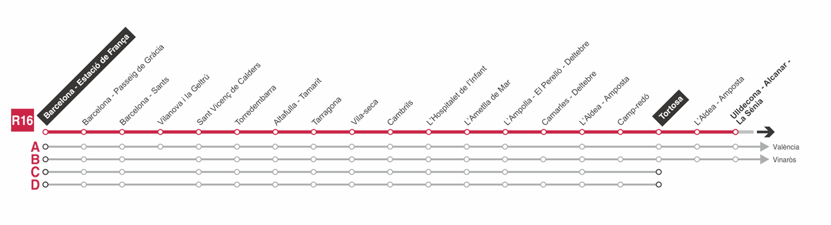 l'Aldea-Amposta. Alguns trens de la línia R16 segueixen