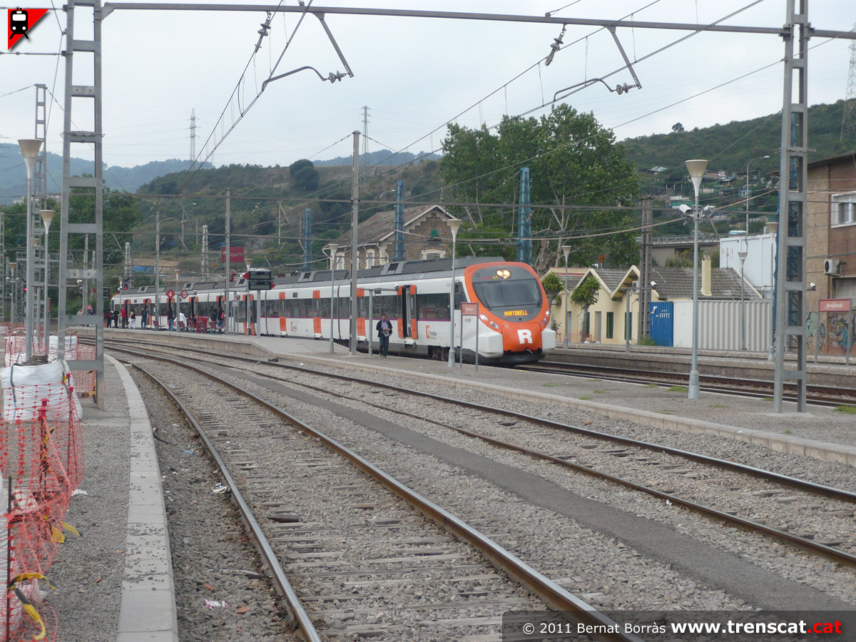 Unitat 447-111 a la via 1 de Montcada Bifurcació amb un R3 procedent de Ripoll (maig 2014) |