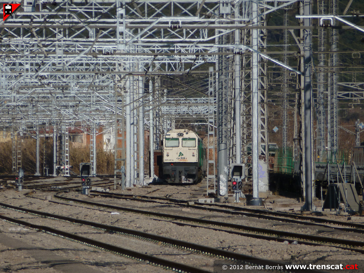 Locomotora 319 d'Adif a la platja de vies de Montcada Bifurcació, amb les obres de substitució dels pòrtics (febrer 2012) |