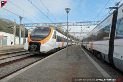 Unitat 447 en simple entrant a Montcada Bifurcació amb un tren a Ripoll (febrer 2012) |